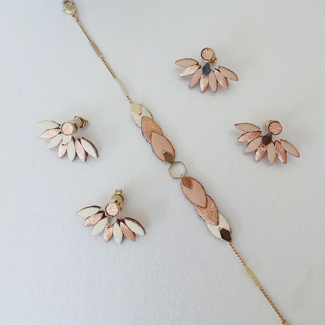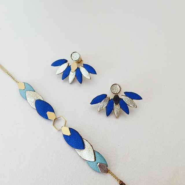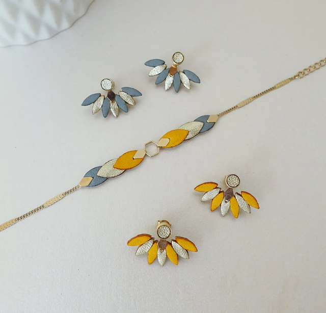 Ce bracelet mêle la douceur du cuir et l’éclat du laiton doré à l’or fin 24K. Les pièces de cuir sont découpées puis assemblées à la main dans mon atelier, formant un motif délicat et coloré aux accents ethnique chic, rehaussé par un hexagone en laiton doré. Chaque étape – de la découpe aux finitions – est réalisée artisanalement, rendant chaque pièce unique.