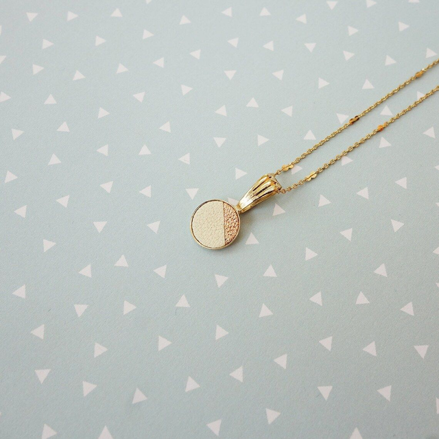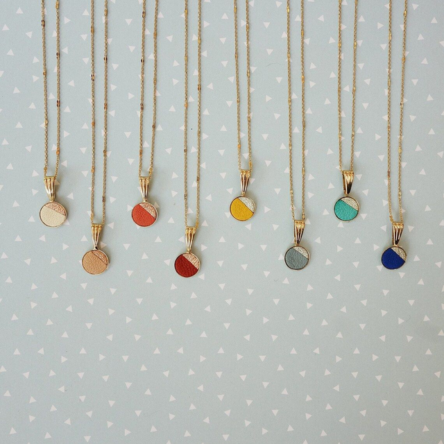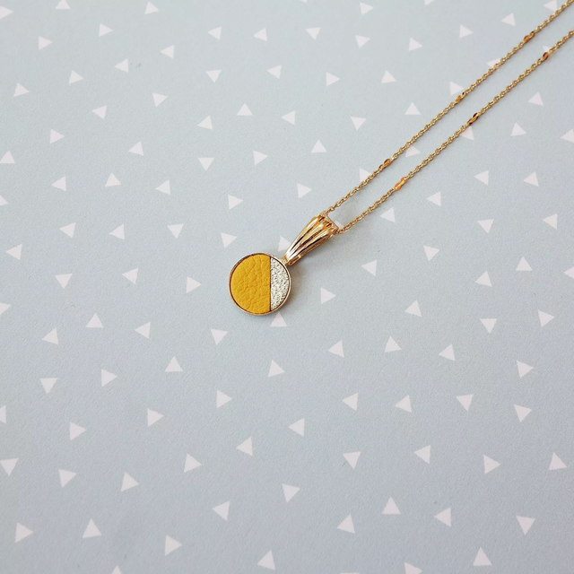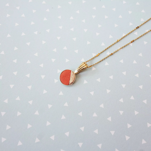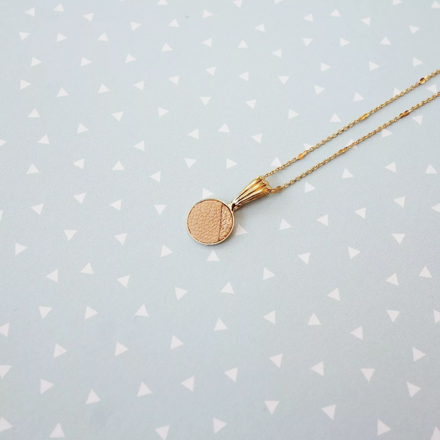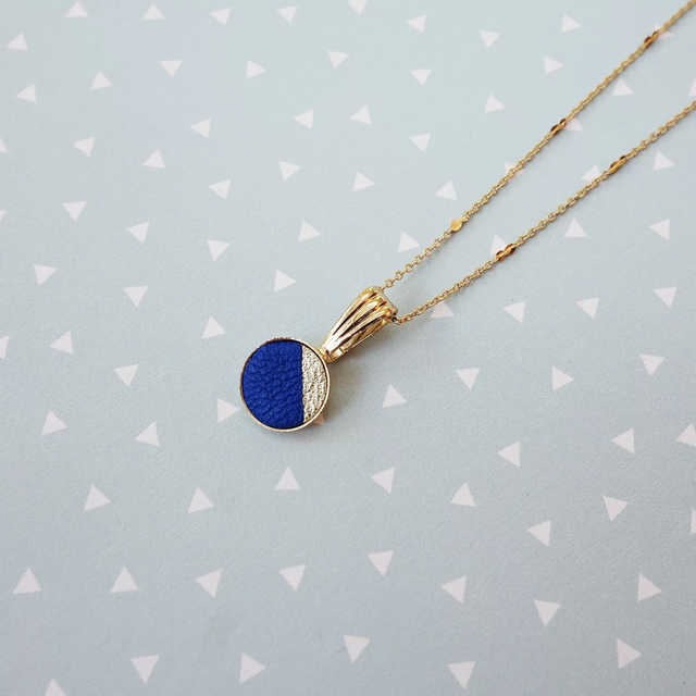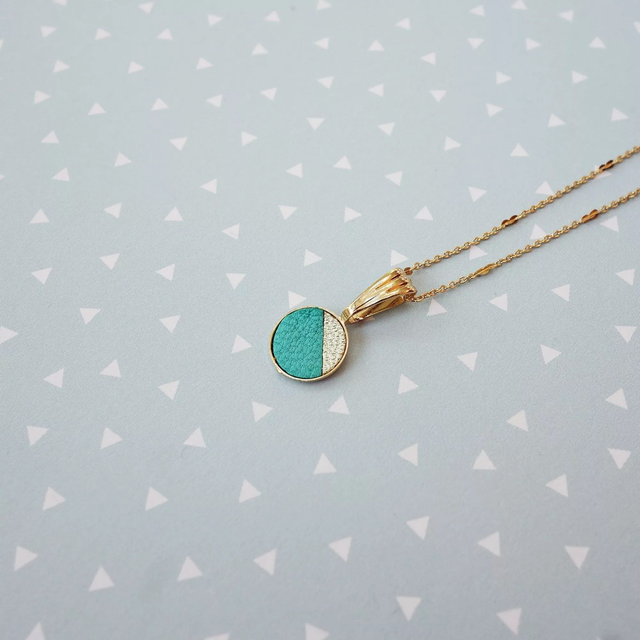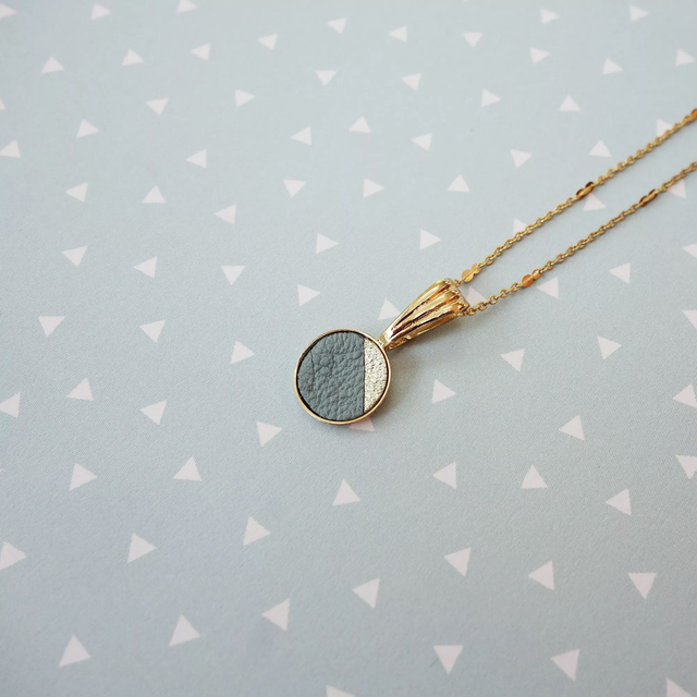 Collier composé d'une pastille de cuir graphique avec sa touche irisée, et serti dans une pièce en laiton soudée à une bélière.